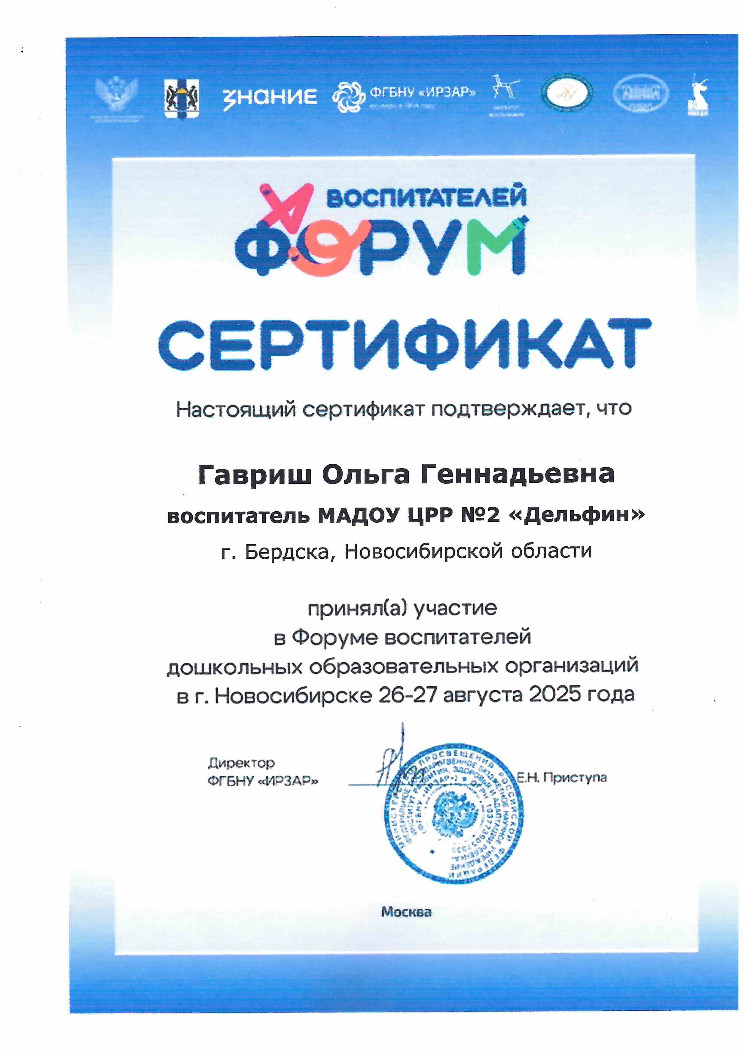 2025г. Сертификат за участие в Форуме воспитателей дошкольных образовательных организаций в г. Новосибирск 26-27 августа 2025 г.
